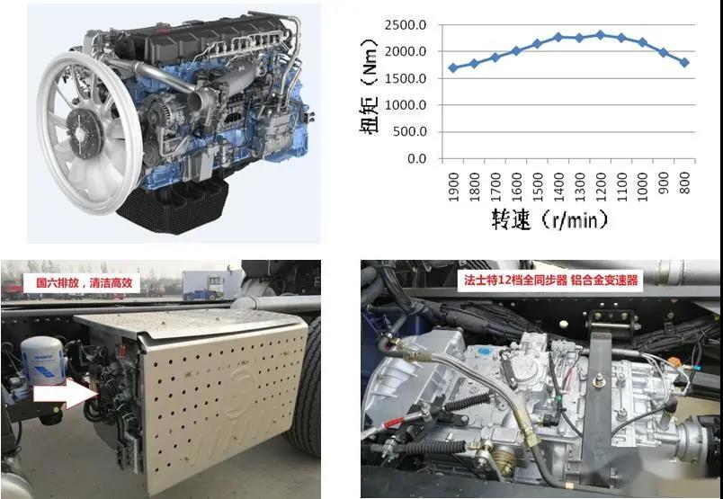 满足国六排放的13升510马力WP13.510E62高效发动机,排放更清洁,最大扭矩2400/950-1400(N·m/rpm),真正的低转速高扭矩发动机,匹配法士特12档全同步器变速器,动力更加强劲,出料效率高,油耗更低。