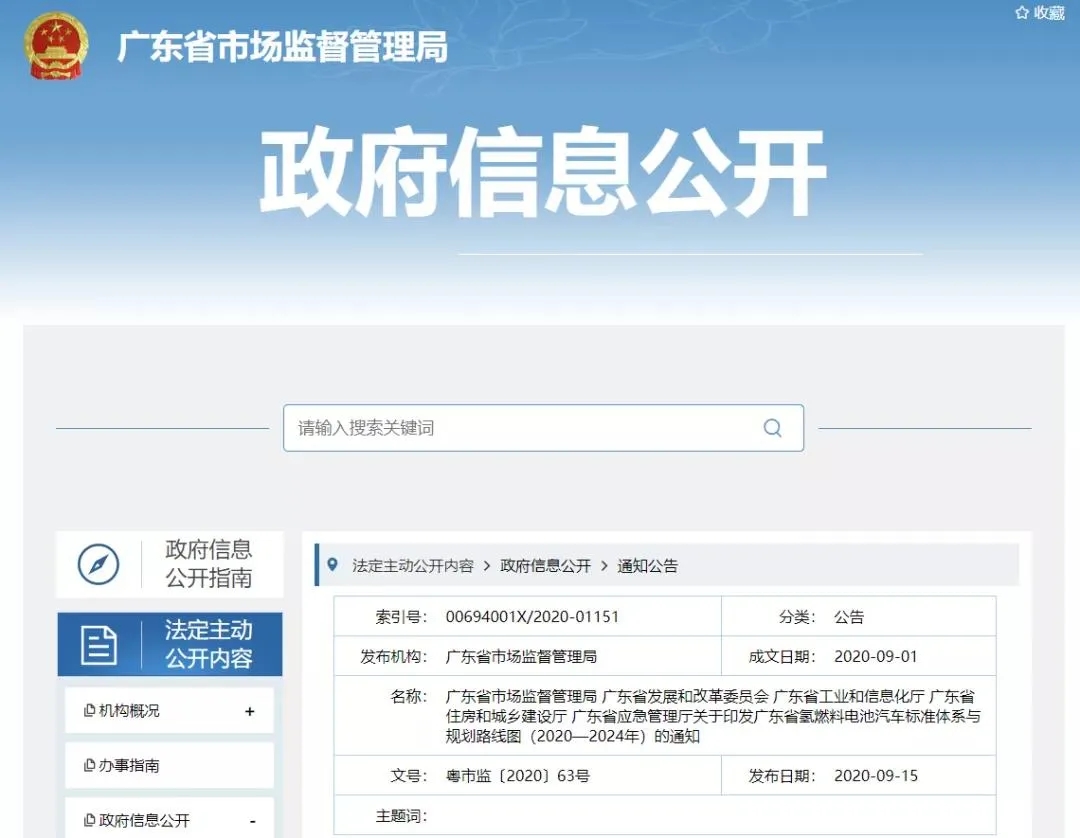近日,广东省发展和改革委员会等4机构正式关于印发广东省氢燃料电池汽车标准体系与规划路线图(2020—2024年)的通知。