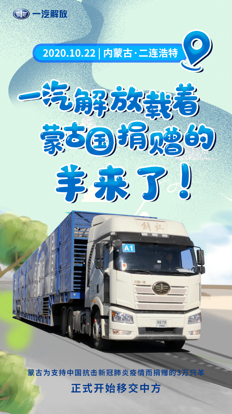 一汽解放载着蒙古国捐的羊来了