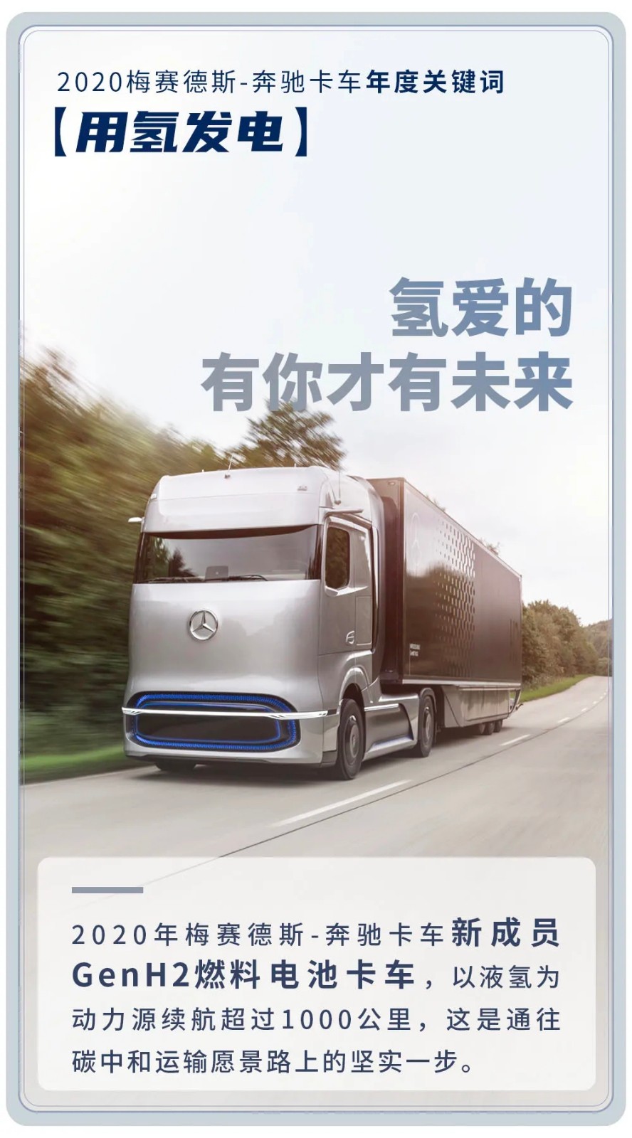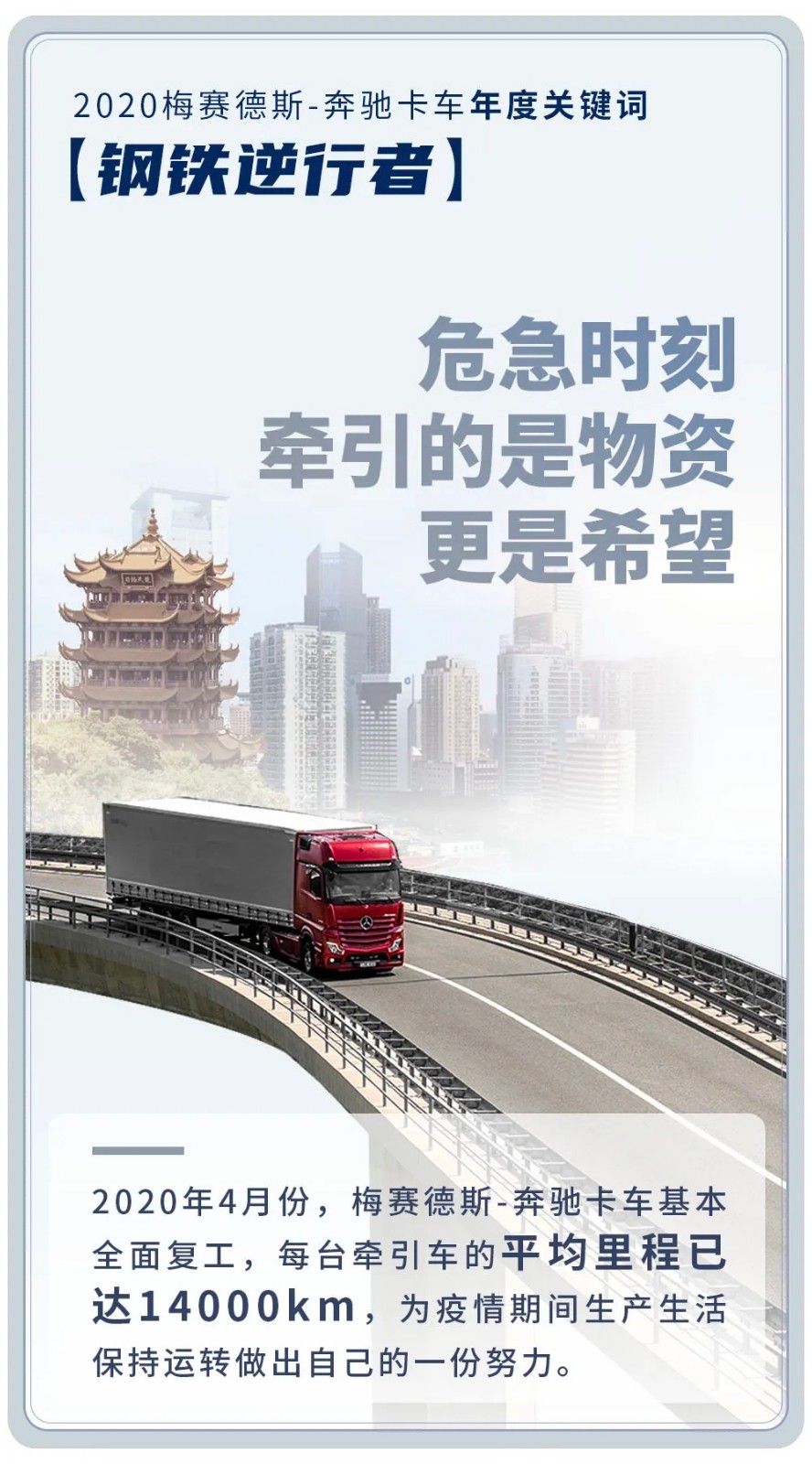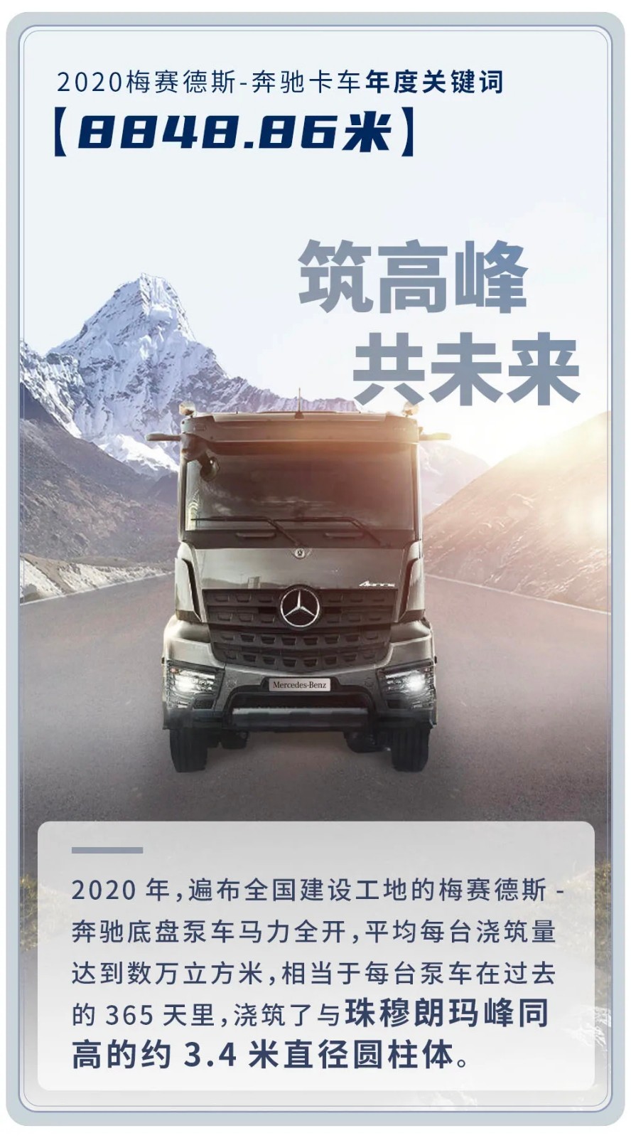 确定的温暖 给用户 让每一次售后服务都能快速解决你的不安 确定的保障 给你我 让牵引车的每一次抵达都能带去一片希望 确定的发展 给社会 让每立方米的浇筑都能撑起未来的高度 确定的环保 给地球 让卡车走过的每一公里都有低碳的印记 确定的创新 给未来 让每一项新科技都有迅速落地的可能 梅赛德斯-奔驰卡车将继续为大家带来更多确定的美好 2021共同携手向着未来奔驰!