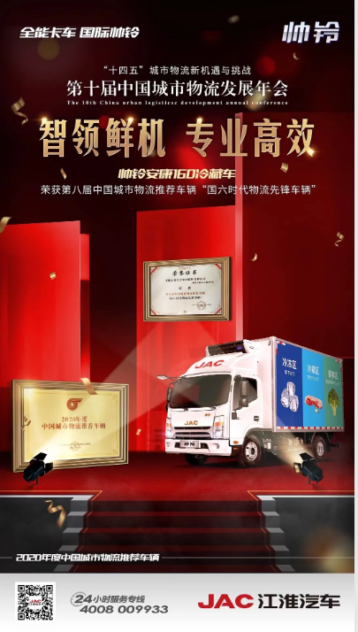 会上,帅铃安康160冷藏车凭借领先的高端品质、完善的服务体系以及良好的市场口碑荣获第八届中国城市物流推荐车辆“国六物流先锋车辆”。 全能国六 城市先锋 随着我国城市化快速发展,城市物流运输需求也在不断扩大,作为中国高端轻卡第一品牌,帅铃全能卡车持续推进产品创新、技术创新,以更可靠、更高效、更省心的国六产品矩阵积极助推城市物流运输向好发展。 帅铃全能卡车针对城市物流运输的特殊需求,采用行业领先的轻量化技术,搭载康明斯全新一代国六动力,在车联网3.0系统的帮助下,为用户提供稳定强劲的动力支持,智能节油,智慧运输。全面提高驾驶体验,充分满足城市物流多样化需求。 专业定制 一路领鲜 后疫情时代,人们对食材的品质与安全有了更高要求,这也使得冷链市场再度“升温”,在冷链运输过程中,一辆好车的助力必不可少。作为中国高端轻卡领军品牌,帅铃一直秉承着以用户需求中心,打造高端品质、高效可靠的帅铃安康160车型,为冷链运输提供一体化解决方案。 面对冷链运输时效性与货品保质的问题,帅铃安康160冷藏车深度定制开发。底盘、厢体、冷机一体化设计,专为冷链运输量身定制。配备帅铃原厂冷藏厢,与中集、飞驰等知名冷链改装企业建立战略合作关系,提供4.2m、5.2m、6.8m等多种厢体供用户选择;可选包括冷王、开利、凯雪等知名品牌的制冷机组。通过专业定制,完美满足水果、水产品、肉制品、速冻食品、医药、蔬菜、乳制品等冷链细分市场的上装需求。 同时,帅铃安康160冷藏车搭载安徽康明斯160马力发动机,遵循康明斯全球统一的质量标准,一步到位达标国六b。3.0L排量爆发160匹强劲马力,峰值扭矩430Nm,低速扭矩360Nm,起步加速性能全面领先,轻松应对复杂路况,有效提高运输效率。为冷链运输提供强劲动力,助力高效运输。 向新而生 砥砺前行 2020年,江淮轻卡进入4.0时代,进行了产品、服务、研发、制造、营销在内的全体系升级。在疫情影响之下,帅铃逆势而上,2020年销售同比增长22%,高端自产及安康动力车型全年销售占比超30%,同比增长70%,稳居中国高端轻卡第一品牌。 站在“十四五”开局之年,帅铃将持续专注产品创新,始终坚守品质为上、用户第一的原则,打造城市物流运输标杆,助推城市物流的蓬勃发展!