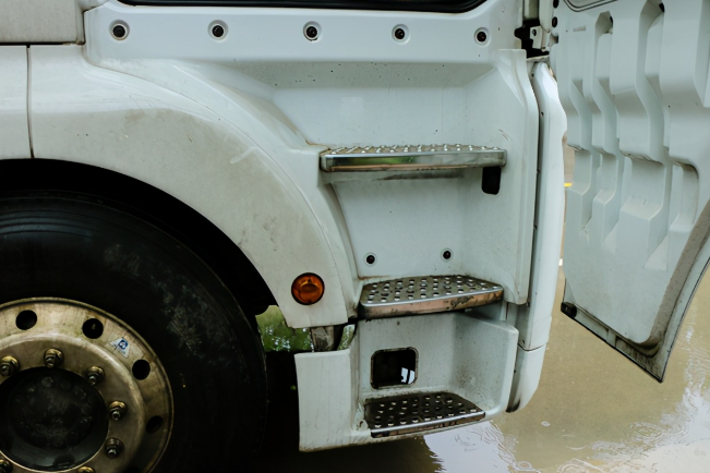 打开车门,可以看到采用铝合金镂空设计的三层蹬车踏板,从下往上向内逐级缩进,人员可以直立姿态轻松进入驾驶室。车门底部的迎宾灯亮度足够,方便夜间蹬车。