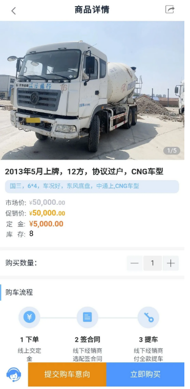目前商城中,共有20余款二手车可供用户选择,在每辆二手车的详情页面上,也做了详尽的介绍,如售价、上牌时间、车况近照、交易流程等,同时也配备了线上一键咨询客服的功能,可进行不同区域的预约看车服务。