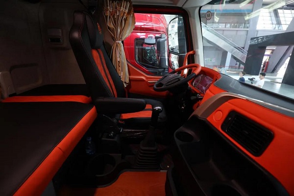 进入驾驶室内,国六版乘龙H7轻奢版牵引车以落日橘红作为主色调,整体色彩饱满。改造后的配色也更符合当前行业中年轻卡友们的审美,除此之外,鲜艳的配色也可以为卡友们带来家一般的感受。
