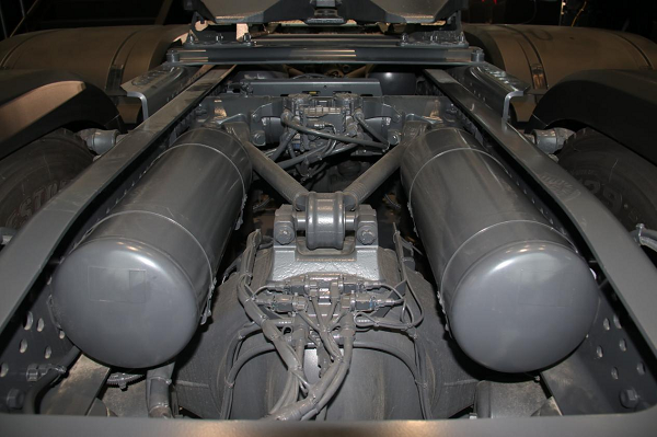 车辆前桥采用7.5t下沉式前桥,悬架为2片抛物线弹簧配平衡杆,后桥采用2 X 13t驱动桥,配空气弹簧悬架,减震效果非常好,适合拉一些易碎品。两个分别为540L和430L的铝质油箱,总容量达970L,即使跑长途也不必太担心。