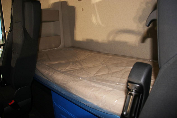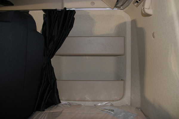 值得一提的是车辆配有舒适的空调系统,4点舒适性弹簧减震,且主驾驶位采用标准气悬平纹布座椅,极大的提升了驾驶的舒适度。在储物方面,该车也表现突出,仪表台下的抽屉容量极大,上下卧铺中间设有储物袋,能够满足驾驶员的生活存储需求。