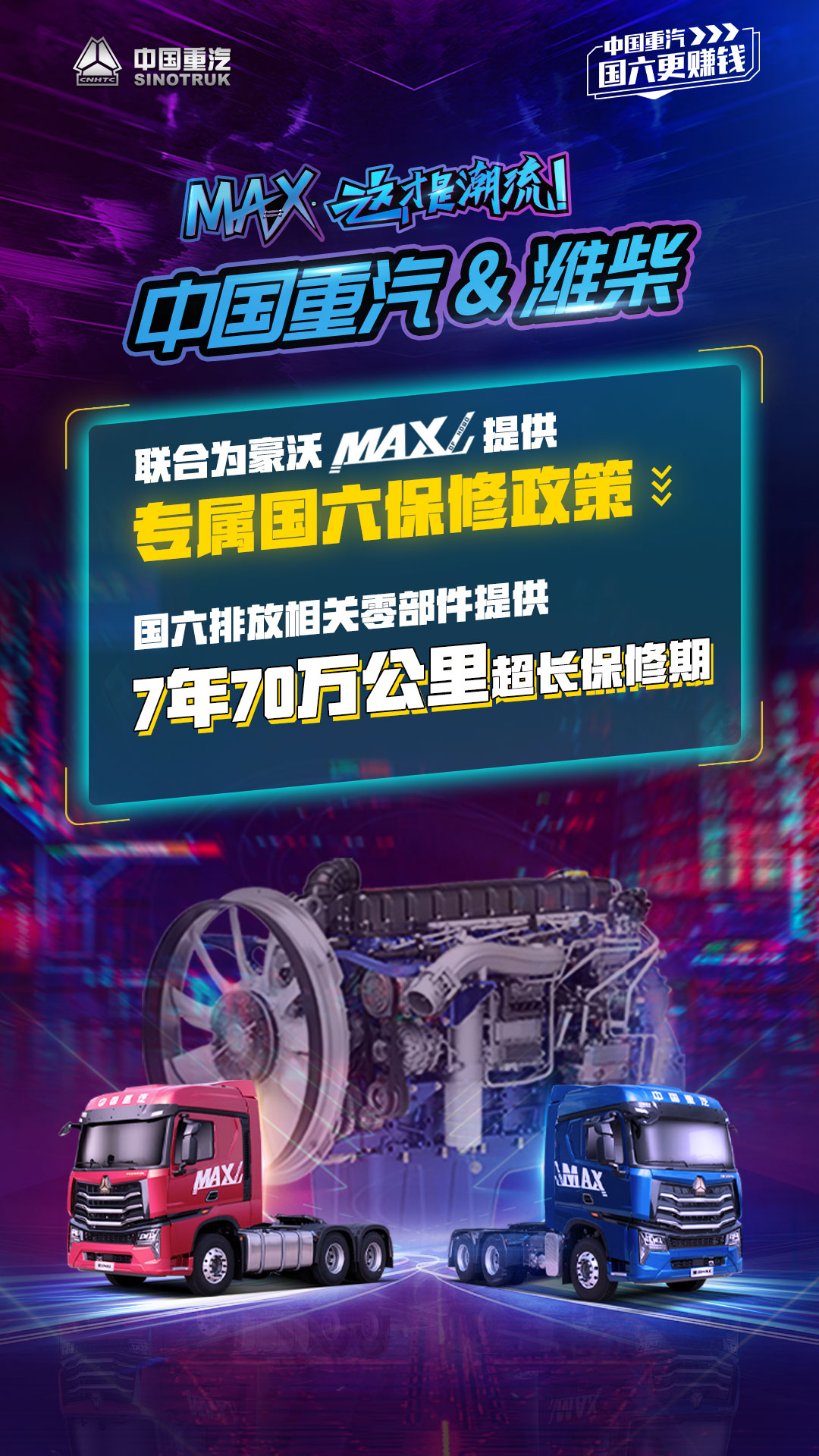 除了出色的颜值和霸气外观,HOWO MAX在动力、安全、智能和节油方面也进行了全面升级。更值得一提的是,中国重汽与潍柴联合为MAX提供专属国六保修政策,为国六排放相关零部件提供7年70万公里超长保修。再添有力保障,保证用车无忧,网友纷纷惊叹——这就是我想要的创富神车!