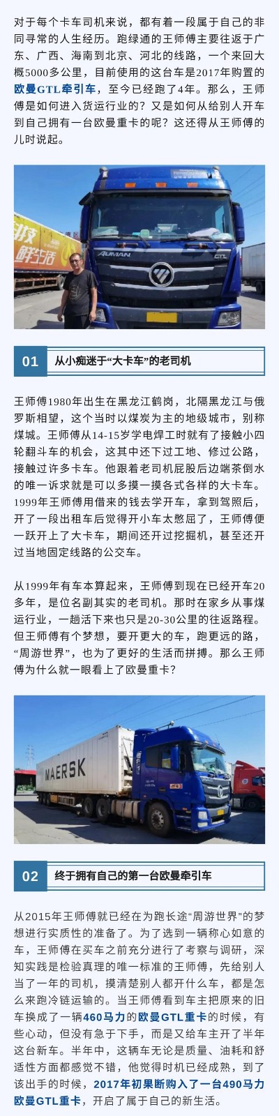 摘要:跑绿通的王师傅主要往返于广东、广西、海南到北京、河北的线路,一个来回大概5000多公里,目前使用的这台车是2017年购置的欧曼GTL牵引车,至今已经跑了4年。