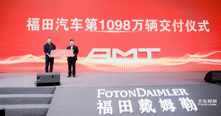 【福田戴姆勒汽车欧曼营销公司总经理杨志江向客户交付福田汽车第1098万辆产品】