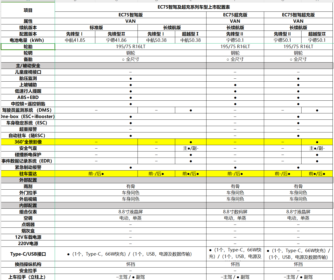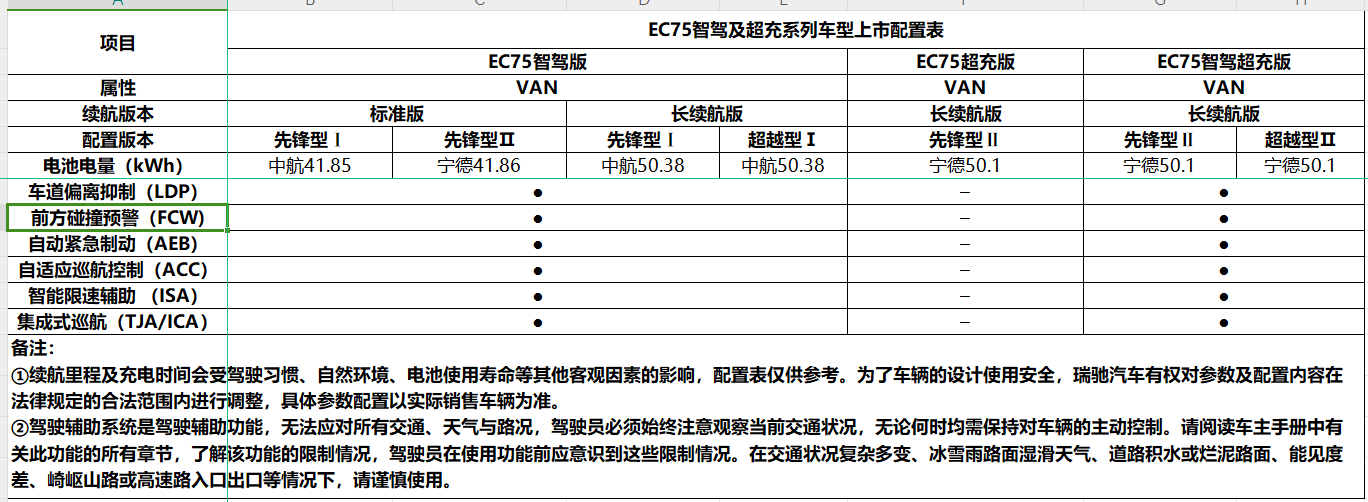 看了车辆全方位的介绍,相信您对瑞驰EC75智驾超充版车型,已经有了比较深的了解。那么究竟哪个配置才最适合您。下面我们附上三版,7款车型的详细配置。这7款车型为了不同的需求定向开发,能够让车辆发挥最大的运营价值。