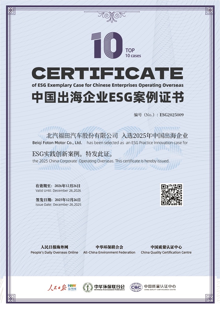 12月26日,由人民日报海外网、中华环保联合会主办,中国质量认证中心联合主办的“第三届中国品牌形象海外传播论坛暨2025中国企业ESG蓝皮书发布会”在人民日报社举行。凭借在ESG领域的卓越实践与全球市场的责任践行,北汽福田成功入选“2025年中国出海企业ESG实践创新案例”TOP10,标志着北汽福田ESG实践再获权威认可。