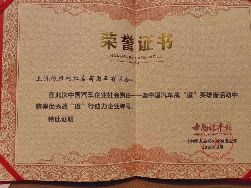 上汽依维柯红岩商用车有限公司(以下简称“上汽红岩”)在疫情期间的防疫抗疫举措和复工复产成绩得到了社会和行业的高度认可,荣获“优秀战‘疫’行动力企业”称号。
