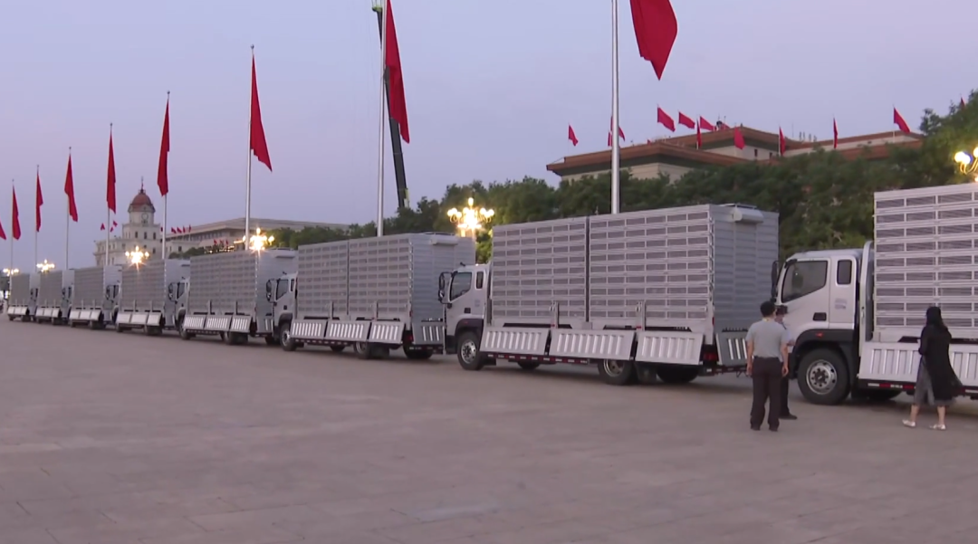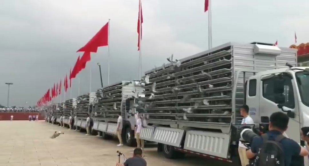 9点30分,18辆福田欧航R系列国六超级中卡和平鸽运输放飞车同时开栏,10万羽象征繁荣、昌盛的和平鸽从四面八方盘旋于天安门广场上方,向全世界传递出中国人民向往和平、追求共同繁荣的美好愿望。